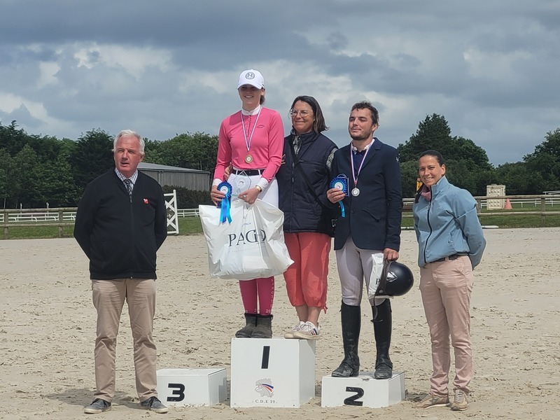 1- OR : ELEONORE VAUVRECY et CQUINOA DU SHOET, BREST EQUITATION, ARGENT : Juliette Léonor et Primtemp des déportés, Ecuries de Cornouaille BRONZE : Eline Crenn Houart et Stormi, ECURIES DE CORNOUAILLE
